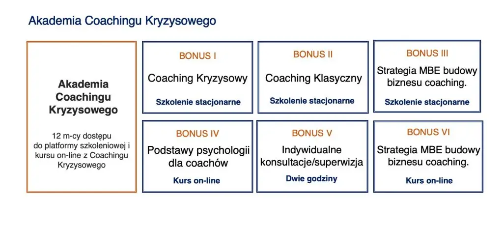 Dla pierwszych 15 uczestników XVII edycji Akademii Coachingu Kryzysowego przygotowaliśmy dostakowe bonusy w postaci 3 szkoleń stacjonarnych oraz dodatkowych kursów on-line na platformie szkoleniowej.